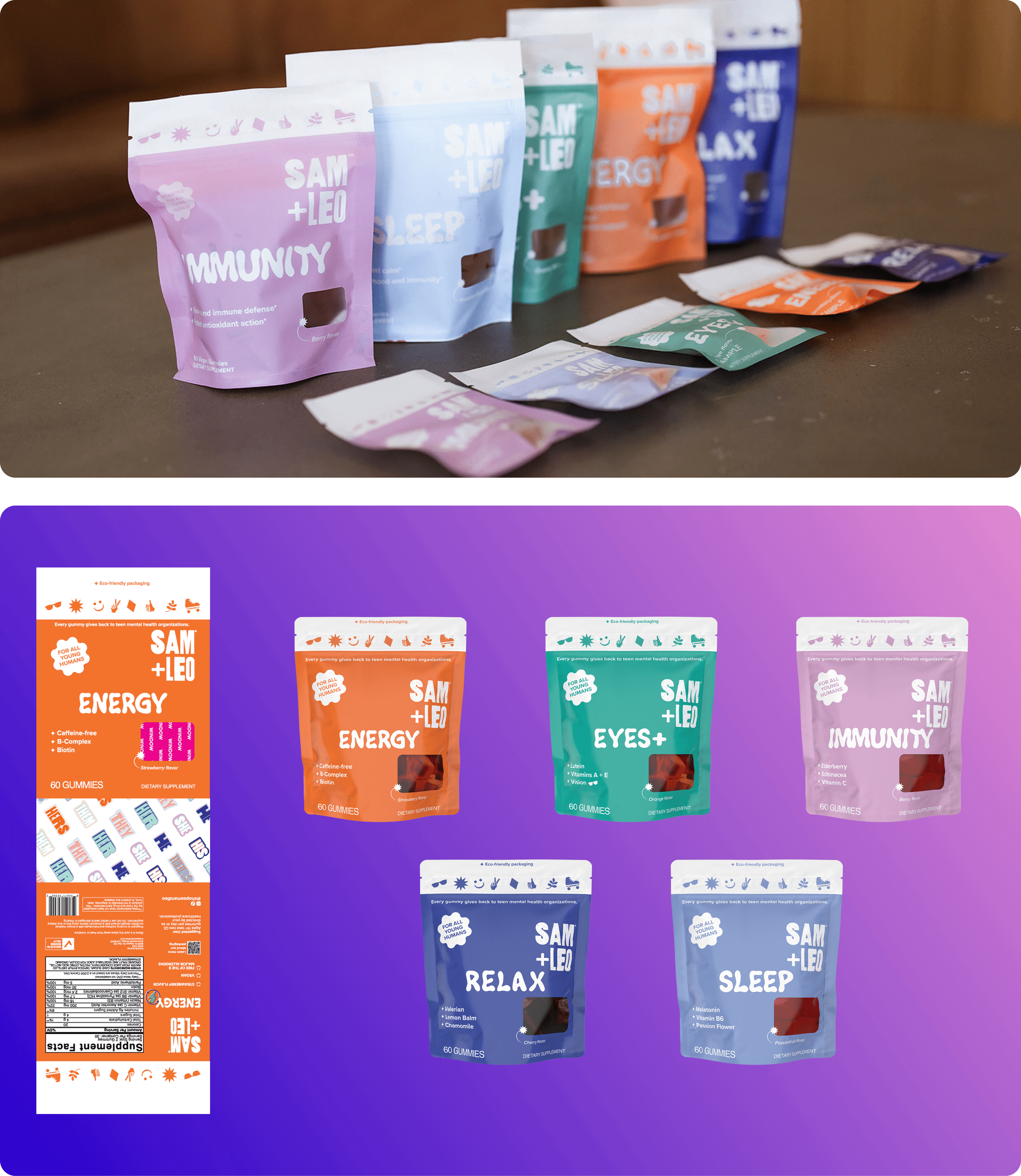 Sam+Leo is a modern wellness brand filling a major gap in the market: the first clean, functional vitamins designed specifically for teens. In preparation for their Fall 2025 launch in Whole Foods Market(!), they partnered with us to elevate their packaging and investor materials. We fully redesigned their product packaging for the 2025 line and developed a sharp, story-driven investor deck to support fundraising and retail readiness. Positioned for shelves and suited for scale. PS - the gummies are delicious, go try them.